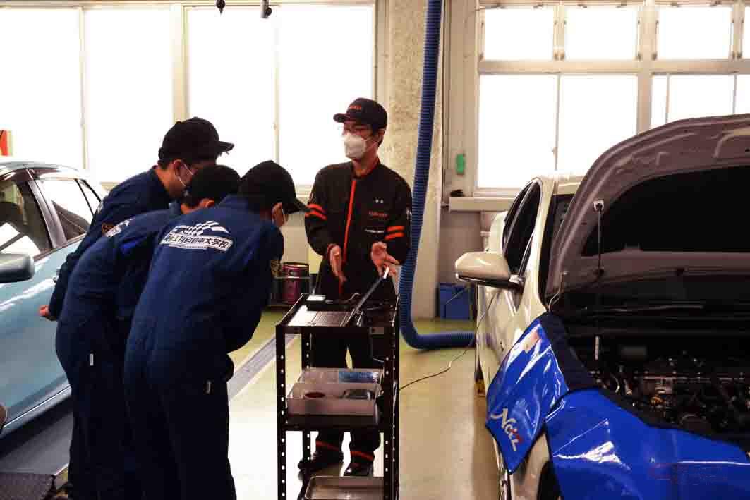 同校では、自動車メーカー等と連携し最新の技術を学ぶ機会をカリキュラムに取り入れている。昨年来、コロナ禍により講習を受け入れ企業も少なく、ウエインズグループの社内教育施設が十分な感染症拡大防止策を講じていることから、今回の講習が実現した。