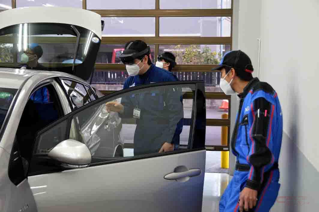 12日に11名、15日に12名、計23名が受講した“新技術講習”は、学生にとってより有意義な時間となるよう、学校と講習内容を調整して決まった。講習では参加学生が3グループに分かれ、①実車を使った故障診断、②先進安全装備体験、③ベンチエンジンを使った故障診断、という三つのセクションを順次回る方式で進められた。②のセクションでは、現在トヨタ自動車が開発を進めているARを使った配線図も体験した。