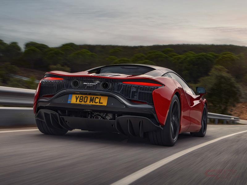 エクステリアデザインでは、いかにもスーパーカーらしい低いノーズに、キャブフォワード、ハイテールのスタンスを採用。マクラーレン特有のディへドラル・ドアは、よりボディに沿って開閉し、ミラーはさらにタイトに折りたたまれて格納され、ドラマチックな雰囲気を演出。短いホイールベースと低いスタンスもさらにこれを強調しており、“シュリンクラップド(包装)” のような外観となった。フォルムは、空力性能と冷却のために気流を整え、パフォーマンスを最大化するよう造形されている。足回りでは、革新的なピレリCyber Tyre®テクノロジーを備える次世代のピレリP ZERO™ CORSAタイヤが、McLaren 600LTが履く究極のP ZERO™ Trofeo Rに匹敵するグリップレベルを実現。