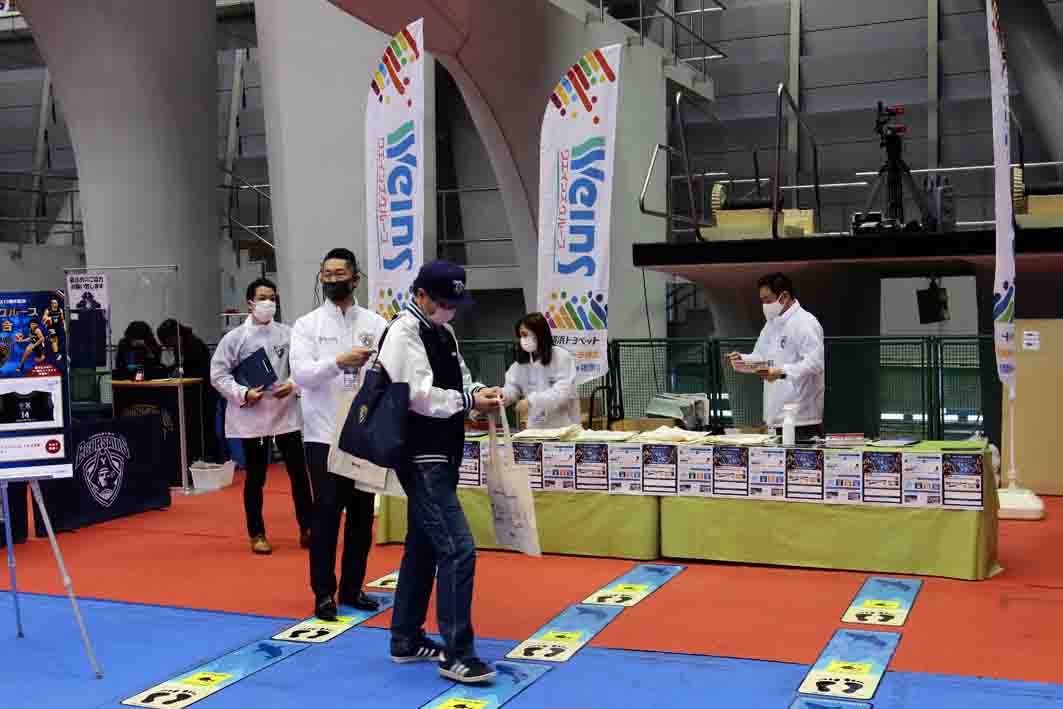 会場内ブースでは、オリジナル商品としてユニホームの形をし、ブラックのチームカラーに彩られた抗菌マスクケースを観戦記念としてプレゼント。さらに、選手の等身大パネル等と一緒に記念撮影ができる、観戦記念フォトスポットを設置した。