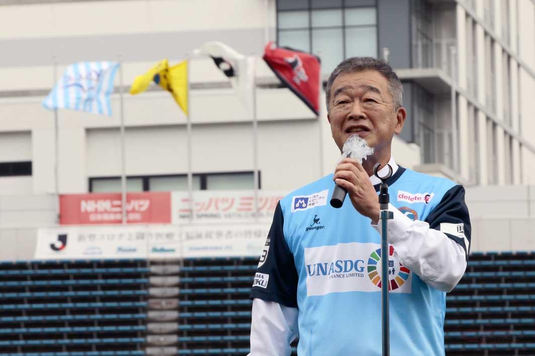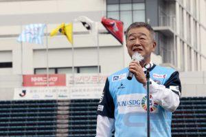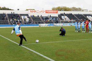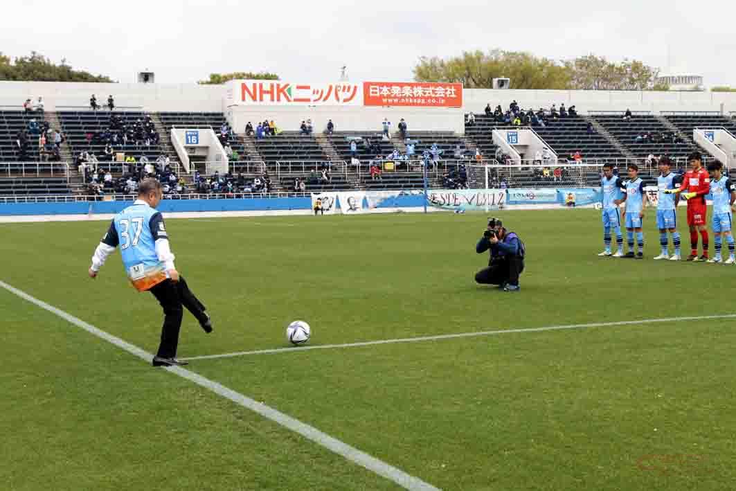 J3戦キックオフ前のセレモニーでは、同社市川社長が観客に向かって自社を紹介するとともに「サッカーやスポーツは私達の生活にとって大きな糧となる大切なもの。これからもサッカーやスポーツを応援してまいります。Y.S.C.C.さんのように地域の皆様から愛される会社を目指してまいります」と挨拶。キックインセレモニー(始球式)に臨んだ。