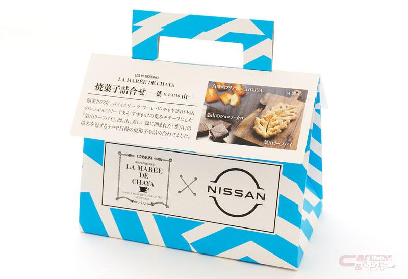 日産は、神奈川県の葉山に店舗を構える株式会社日影茶屋とコラボレーションし、「リーフ」と日影茶屋が運営する洋菓子店パティスリー ラ・マーレ・ド・チャヤの「葉山リーフパイ」の特別コラボレーション商品「NISSAN&CHAYAバック LEAF」を、パティスリー ラ・マーレ・ド・チャヤ葉山本店と日産本社ギャラリー内ブティック、銀座クロッシングにおいて4月1日より発売した。