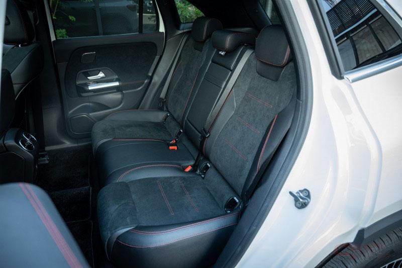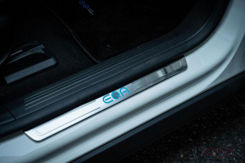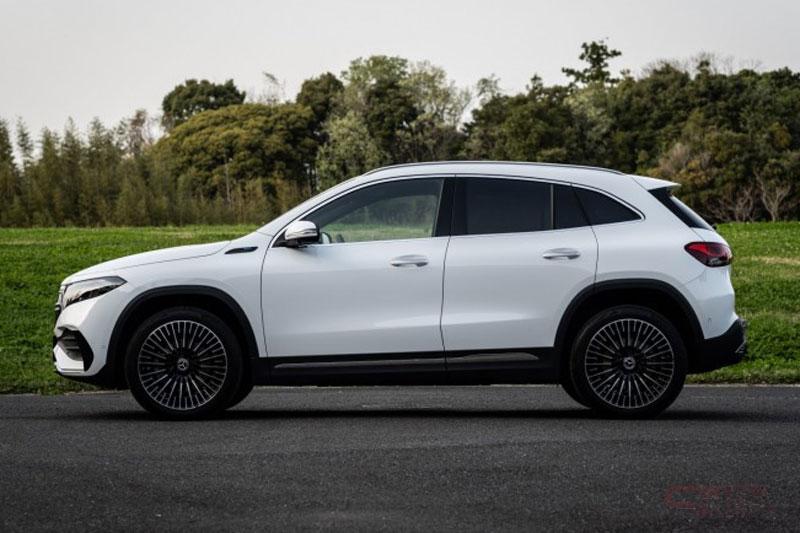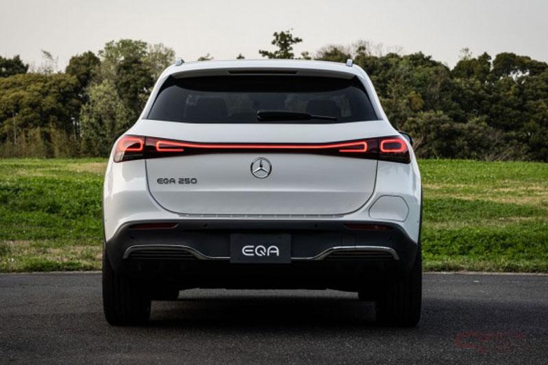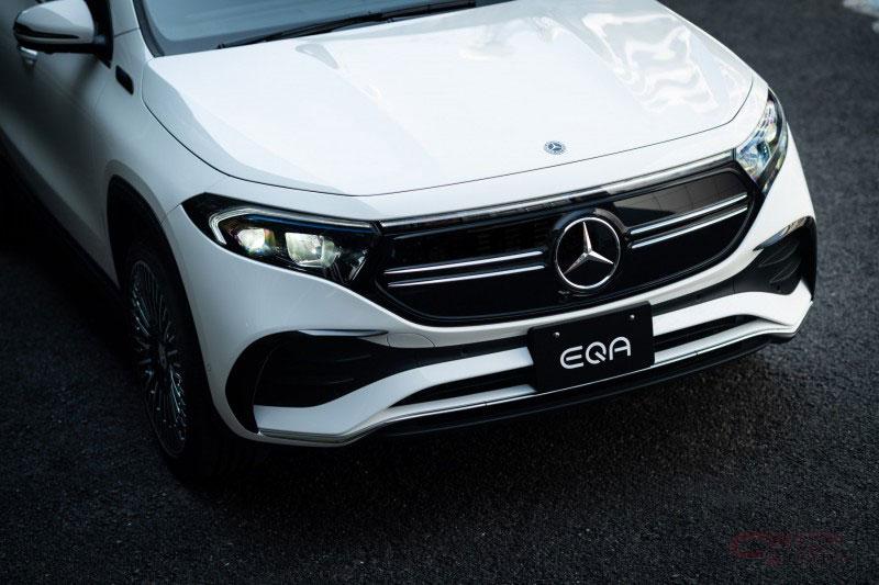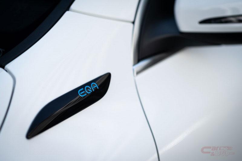 エクステリアデザインは、前後のオーバーハングが短く、パワフルでありながら、クーペのようにスタイリッシュで、曲線を用いたデザインが特徴の都市型SUVのプロポーションで、フロントには中央にスリーポインテッドスターを配したブラックパネルグリルを採用。また、水平に伸びる光ファイバーの帯がフルLEDヘッドライトのデイタイムランニングライトを結び付けている。AMGラインを選択すると、フロントのブラックパネルグリルにハイグロスブラックのフレームとツインルーバーがあしらわれ、引き締まったスポーティな印象を演出している。サイドビューは、メルセデス・ベンツの都市型SUVの特徴である、シンプルな力強さと、リアエンドにむかってなだらかに下降していくルーフラインと上下方向にスリムなサイドウィンドウを採用し、スタイリッシュさを表現しており、Aピラーの下端部には青文字の“EQA”バッジを装備している。標準仕様には、空力を追求した18インチの5スポークアルミホイール、AMGライン仕様には繊細なデザインが特徴の20インチのAMGマルチスポークアルミホイールを装備。LEDリアコンビネーションランプは、中央に向けて次第に細くなるLEDのライトストリップに滑らかに一体化されている。