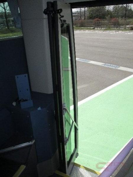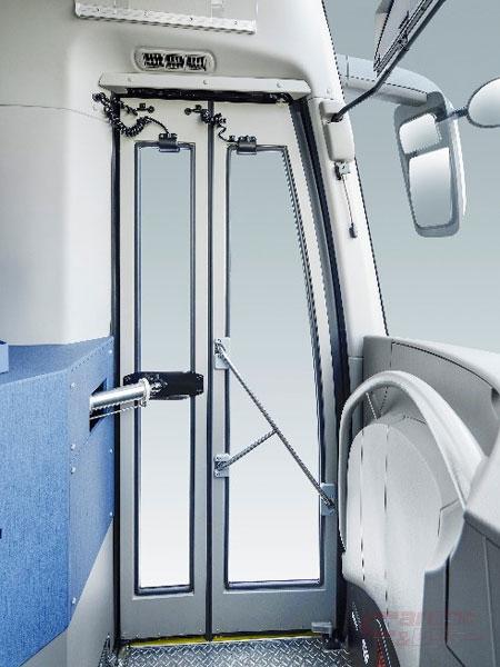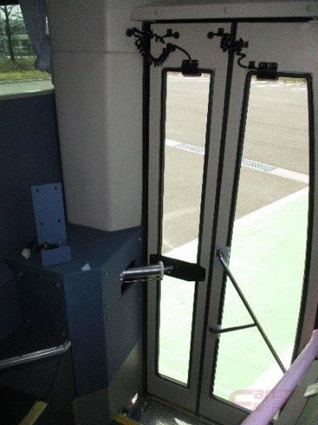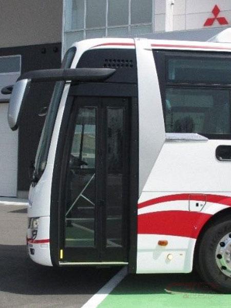 折戸仕様の大型観光バスは、乗客の乗降性の向上、視認性や事故等を防ぐ安全性の向上、定時運行の安定性の向上が期待できるメリットがあり、乗客の乗降性では、扉が大きくはみ出すスイング扉と比べて折戸扉は突出量が少なく、乗客が待機する停留所に近い場所での停車が可能となる。またステップ幅を拡大したほか、昇降握り棒も左右両側に設置することで、乗客にとって乗り降りし易いように乗降性を向上した。安全性では、同時に路肩に沿った停車ができるため、自転車やバイクの侵入を防ぎ、巻き込み事故や衝突事故を防止するほか、車両側面の行き先表示版を入り口近くに設置することで、ドア開時の行先表示ならびに運転席からのミラー左後方の視界がより見やすいなど視認性を向上した。定時運行の安定性では、スイング扉と比べて停留所でのドア開閉の時間が短縮でき、乗降もし易いことから乗客の定時運行により貢献できる車両となっている。