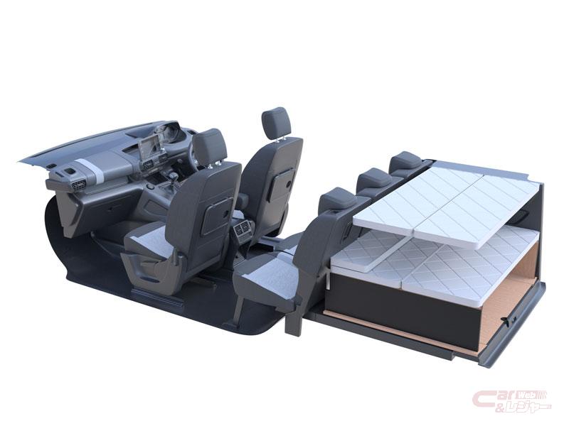 ベッド展開時のサイズは底面サイズ1800mm×1200mm、ベッド厚さは約45mm、大人2名が充分に快適に寝られるサイズを確保。また、展開時の室内高は890mm(ModuTop®装備車両=SHINE XTR PACKもしくはSHINEの場合)、ベッド下は収納に活用できる270mmの空間が確保される。ベッドは5分割してラゲッジスペースに収納でき、収納および展開に必要な時間は1分程度となる。また、収納時でもリアシートを使うことができるほか、ベッド部分は収納棚として利用できるため、4名もしくは5名乗車での移動が可能なうえ、無加工で取り付けが可能となっている。