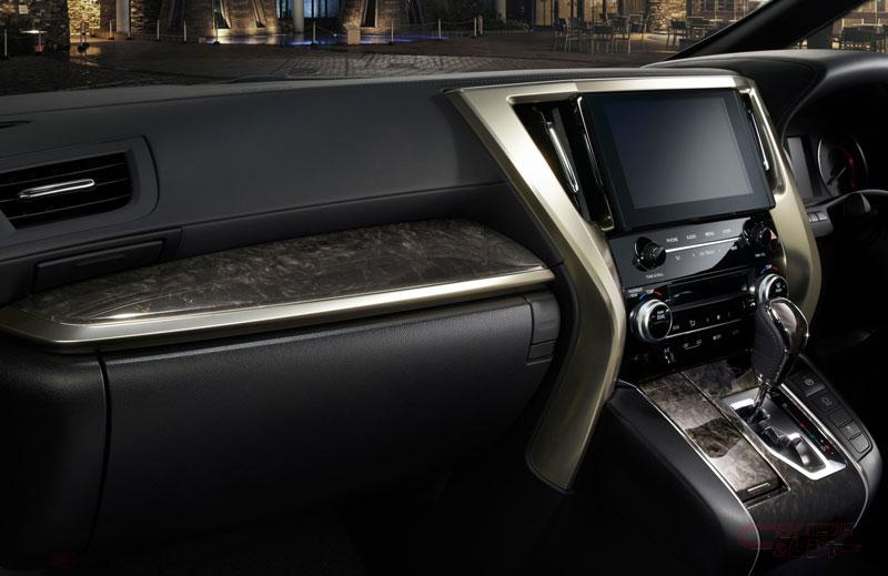 アルファード特別仕様車 S“TYPE GOLD Ⅱ”(ベース車 : S)では、内装にサンバーストゴールドの木目調パネルやゴールドスパッタリング加飾を随所に施し、さりげないゴールドの華やかさを演出している。