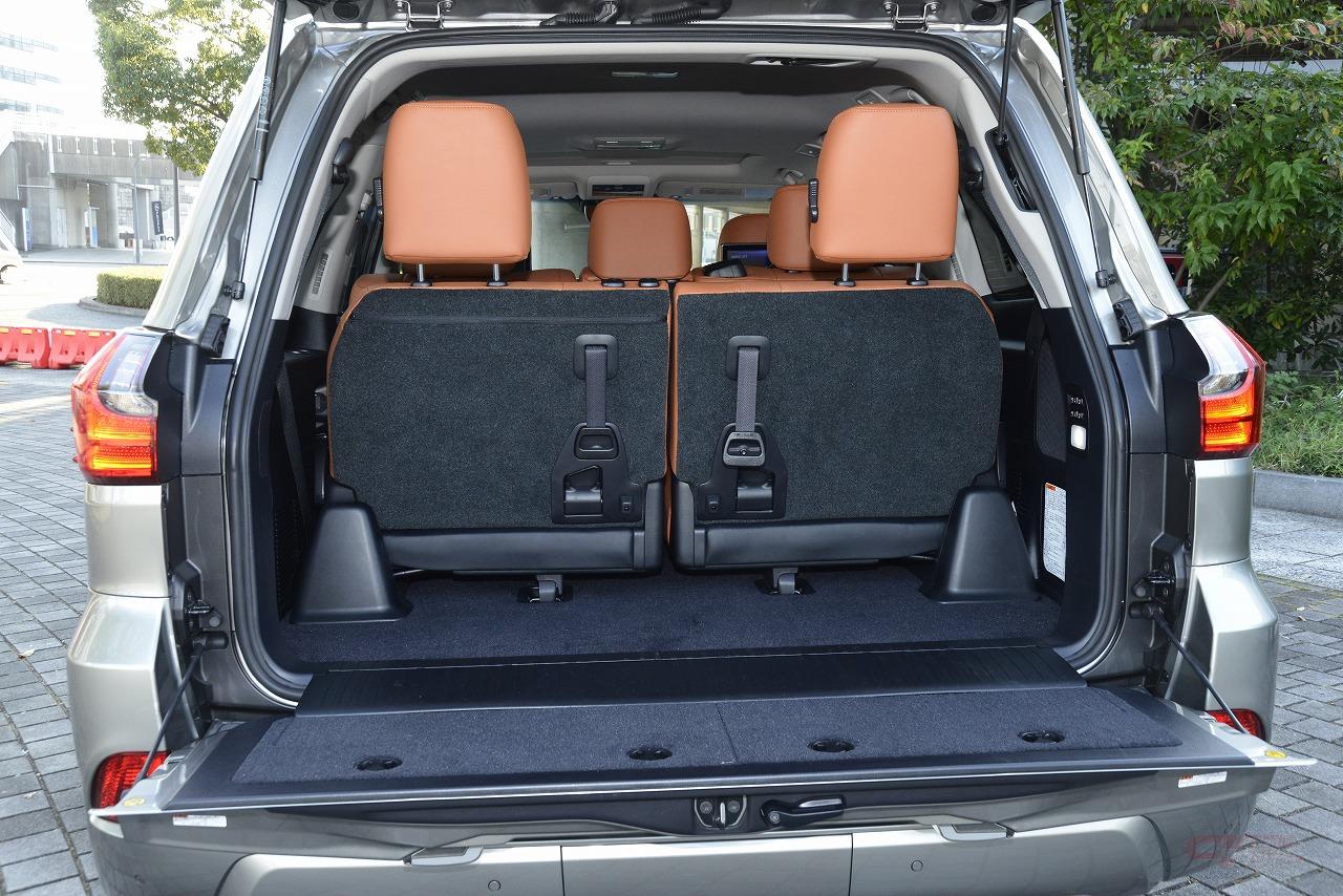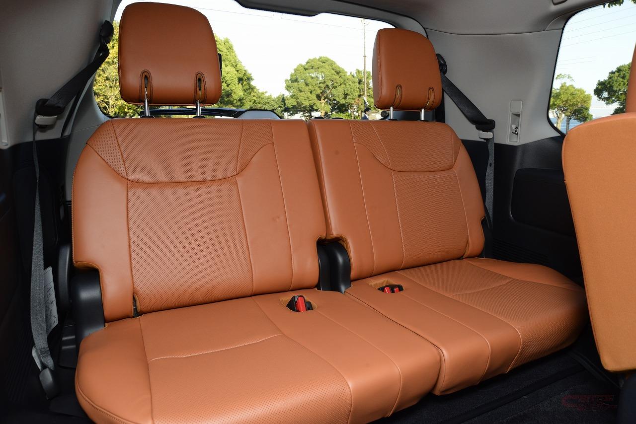 ガソリンエンジンモデルに3列シート仕様車を設定。室内長はランドクルーザー/プラドと並んで2520mmと、今回紹介するモデルの中では一番短くなっている。3列目の居住性は大人が長時間座るには厳しく、3列目シートを展開した状態での荷室容量は150Lで、SUVとしては使い勝手は良くない。2列目と3列目を倒すと床面はフラットになり、荷室後部のボードを上段にすれば荷室との段差も解消できる。