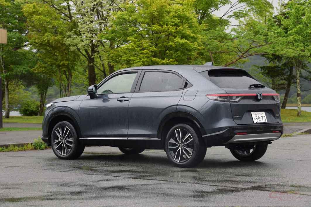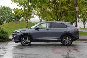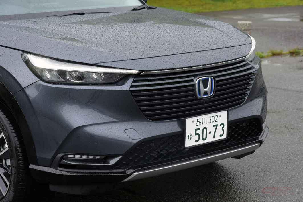 クーペスタイルを売りにするヴェゼルは、新型になりCピラーの傾斜が大きくなりキャビン部が強調され、さらにクーペに寄ったスタイルになった。中核グレードには18インチタイヤが標準装着され、タイヤアーチが強調されるデザインによりサイドビューは一段と力強さが感じられる。フロントグリルは間隔が細かい横桟で、ボディと一体化されたデザインが新しさを感じさせた。