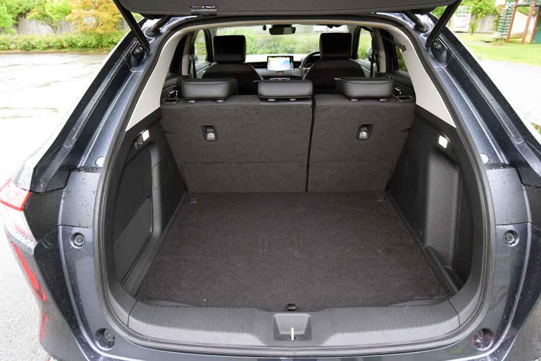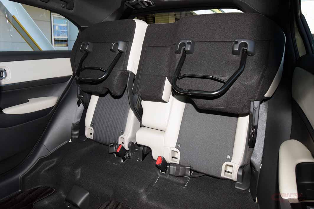 後席は背もたれを前に倒せる“ダイブダウン”と、座面を上に跳ね上げられる“チップアップ”のアレンジを持ち、室内も荷室として活用することもできる。ラゲージスペースは左右の張り出しが少なく、ダイブダウンによりフラットなスペースが出現する。