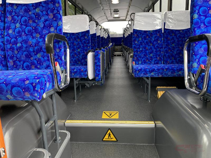 大型送迎バスの前扉仕様車は、中扉をなくすことにより座席数を増やすことでより多くの乗車客を着座で快適に目的地まで送迎できるメリットがあり、通常の「エアロスター」ワンステップ車では座席数が最大で34席であるのに対し、前扉仕様車の場合には49席まで増やすことができるほか、車前輪のタイヤ上に位置するフロントフェンダー以降の客席フロアをフラットに出来るため、容易な車内移動も実現する。
