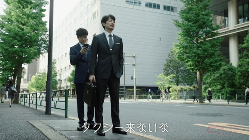俳優の竹野内豊さんを起用した新CMでは、スタイリッシュな部長役を竹野内さんが演じ、一見スマートに見える竹野内さんが、前原さん演じるタクシーアプリを使いこなす部下に出し抜かれてしまう様子をコミカルに描いている。CMの中で見せる挑発的な微笑みや、雨の中、傘と大量の荷物にもたつく様子など、普段の凛々しくかっこいい竹野内さんとは少し違った天然キャラの部長姿が見どころとなっている。