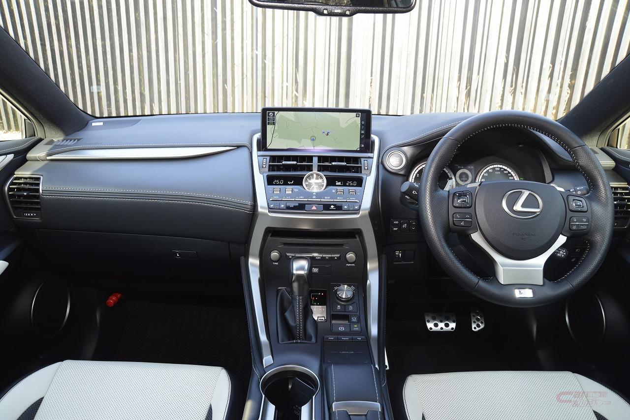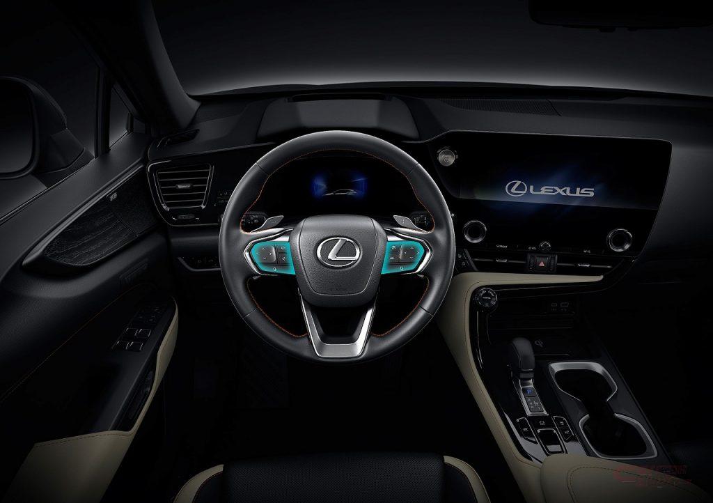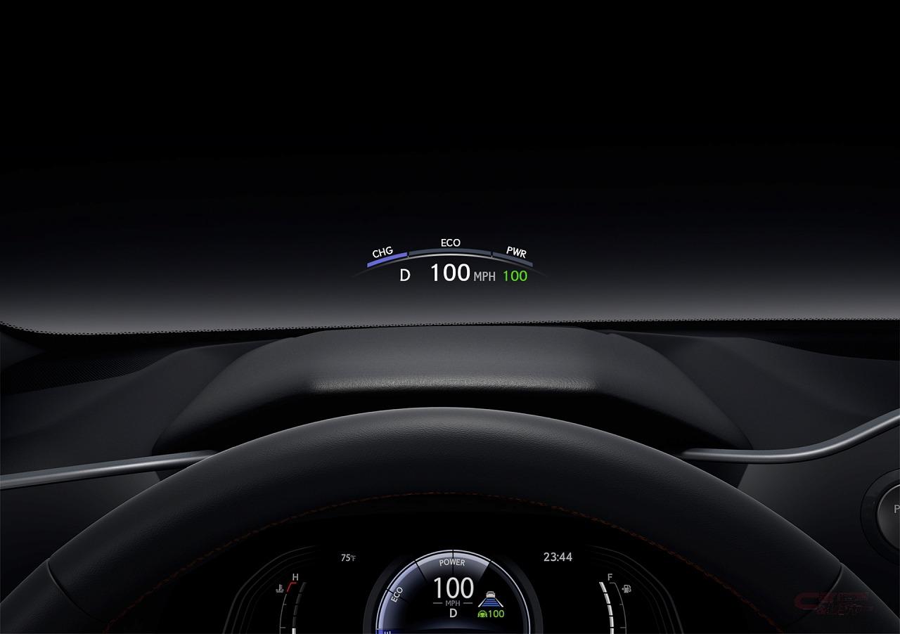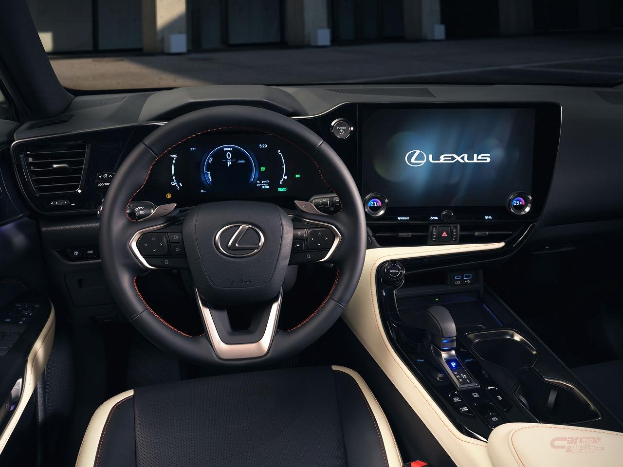 インテリアは、エクステリア以上に変化が感じられる。コックピットは、2019年に発表したコンセプトカー「LF-30 Electrified」で発表した「Tazuna Concept」に基づき、人が馬を操る際に使う「手綱」に着想を得てデザイン。現行NXと現行では装備されていないヘッドアップディスプレイとステアリングのタッチセンサースイッチを組み合わせた新たな操作方法「タッチトレーサーオペレーション」を採用し、ステアリングスイッチとヘッドアップディスプレイを高度に連携。視線移動や煩雑なスイッチ操作をすることなく、運転に集中しながらナビゲーションやオーディオ、ドライブモードセレクトなど、各種機能の制御が可能な空間を実現したという。