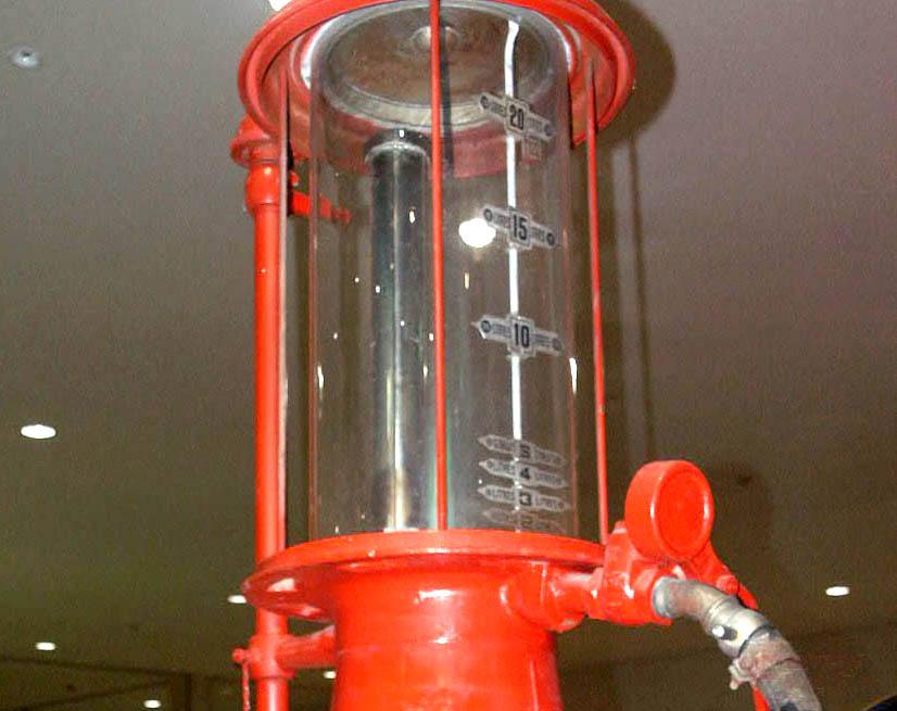 昭和8年生まれの私が幼少年期は、写真(左)のような移動型ばかりで、丸ハンドルをクルクルと回して(梃子=レバー式もあり)、上部ガラス容器を満たし、側面の目盛り(1.2.3.4.5.10.15.20ℓ)を見ながら客の注文量に達すると、手前のホースを車の給油孔に差し込み、あとは重力で落ちてくるという、単純きわまりない仕掛けだった。