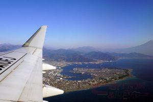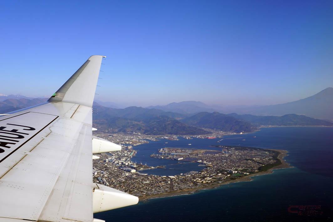 世界文化遺産 富士山周辺は特別な飛行許可を得て高度約5000mで飛行(通常は約1万m)するので、迫力のある富士山と富士五湖、三保松原等が見られる。