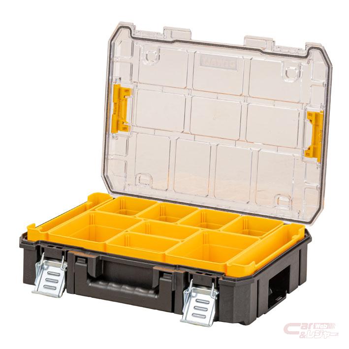 ■オーガナイザートップ:持ち運びが快適なロングハンドルを採用。上蓋内に?物収納に便利なコンパートメント、ボックス内には電動工具類の収納に適したウレタンフォーム付き。〈仕様〉ハンドル耐荷重30㎏/防水・防塵IP54準拠/本体重量約2.56㎏/収容容量約14.0リッター/サイズ=幅440㎜×長さ333㎜×高さ183㎜〈参考価格〉7700円
