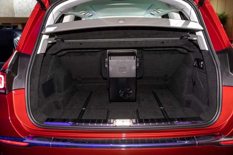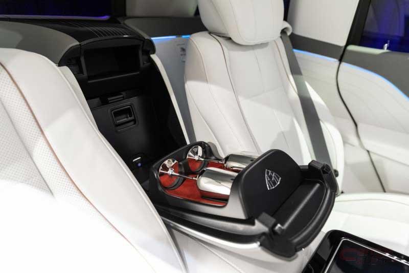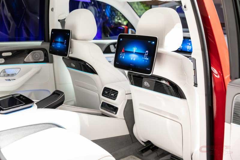 GLS の3列シートを2列にしたことで後席をGLSよりも120mm後方へ配置して余裕あるレッグスペースを確保。後席バックレストの通常の角度は27度となり、1,020mmのヘッドクリアランスを有している。さらに、メルセデス・マイバッハSクラスと同様に最大で43.5度までのリクライニングが可能なほか、後席の後方にはパーセルシェルフが付いた固定式のパーティションを設置、居住スペースとラゲッジスペースを分離することで、ボディ剛性/騒音レベルや空調効果の向上を実現した。ほかにも、大型のクーリングボックス、温度調整機能が備わったカップホルダー、快適機能のすべてを操作できる7インチ画面のMBUXリアタブレットを装備しているほか、Burmesterハイエンド 3D サラウンドサウンドシステムを標準装備している。