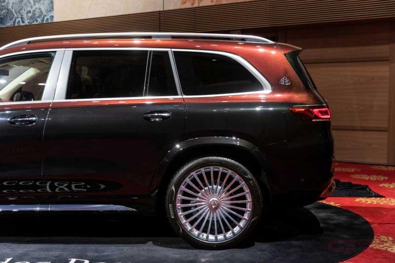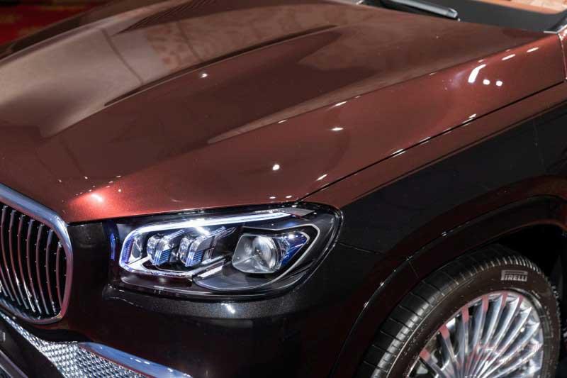 フロントにメルセデス・ベンツのSUVで唯一、伝統の「スリーポインテッドスター」が輝くボンネットマスコットを採用。フロントグリルは縦方向のピンストライプをモチーフとしており、フロントグリルを取り囲むクロームの上部中央には「MAYBACH」の文字が刻まれている。フロントエプロンには、エンジンルーム内の冷却機能も備えた、クローム処理が施されたメッシュのエアインテークを装備している。サイドビューでは、後席空間の広さが外観からも想起できるクローム仕上げのBピラー、ハイグロスクローム仕上げのルーフレールを採用。また、Dピラーにはメルセデス・マイバッハのエンブレムをあしらっているほか、メルセデス・ベンツ社が製造する乗用車の中で最大の23インチのアルミホイール装備し、フロントグリルのピンストライプをモチーフとした鍛造でポリッシュ仕上げのマルチスポークデザインによりエレガントな印象を演出している。リアにおいてはスリーポインテッドスター下部とリアバンパー上部を走る2本のクロームトリムにより水平基調のデザインを表現しており、バンパー下部のアンダーガードと左右のエグゾーストエンドをハイグロスクローム仕上げとすることで一体化しているようなアピアランスを形成している。