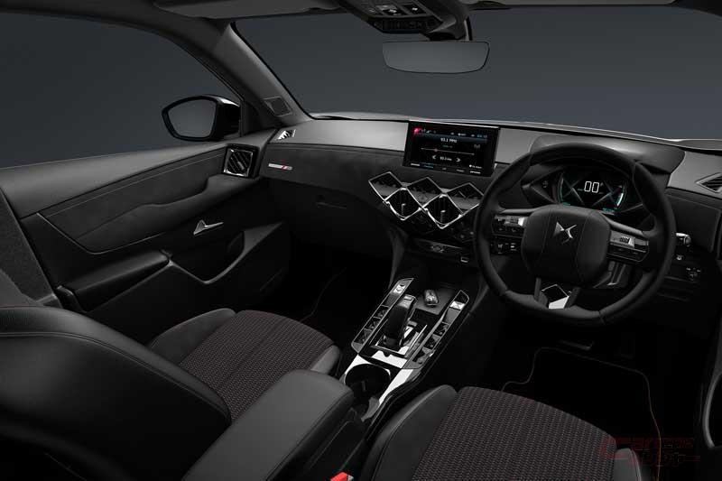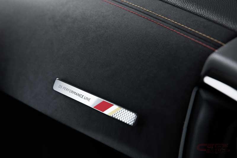 今回発売した「DS 3 クロスバック Eテンス パフォーマンスライン」は、インテリアとエクステリアにおいて、DS TECHEETAH Formula E Team由来のスポーティなエッセンスとフレンチラグジュアリーを融合。フロントグリルのDSウイングのクロームとリアランプ下端はマットブラック仕上げとし、グロスブラックのリアガーニッシュ、オニキスブラックにカルマンのセンターキャップがアクセントとなる18インチの”MONZA”ホイールなど、異なる質感と表情を持つ黒を組み合わせスポーティかつエレガンスさを演出している。また、インテリアのダッシュボード、ドアトリムにアルカンタラ®を採用し、シートでは座面中央をカルマンをアクセントカラーとした立体的なファブリックに、サイドサポート内側をアルカンタラ®とし身体のホールド性を高めてスポーツ走行に対応している。ステアリングホイール、ダッシュボード、ドアトリムなどのステッチはPERFORMANCE Lineのイメージカラーであるカルマン(カーマインレッド)とゴールドに統一している。