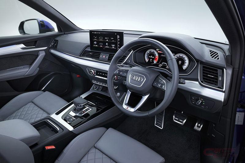 インテリアにおいては、「Q5」と同様に最新のインフォテインメントシステムMIB3を採用。10.1インチにサイズアップしたセンタースクリーンはタッチパネル式となり操作性の向上を図るとともに、よりシンプルでクリーンなコックピットデザインを実現した。ネットワーク接続はeSIMにより実施する。また、シート素材はadvancedはスタンダード仕様、S lineはマイクロファイバースエードのダイナミカ(Dinamica)とレザーのコンビネーションを採用し、さらにadvancedには、ドアアームレストやセンターコンソールにアーティフィシャルレザーを使用し、リヤシートヒーターなどを採用したラグジュアリーパッケージを設定している。