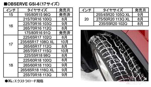 同社は、日本の気温の変動が大きくなる昨今の気候を踏まえ、スタッドレスタイヤに不安定な路面状況に対応できる性能が求められていると考え、日本の降雪期に求められる性能を追求したSUV専用のスタッドレスタイヤとして、「OBSERVE GSi-6」と「OBSERVE W/T-R」をラインアップした。