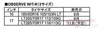 さまざまな状況に変化する冬の路面でのハンドリング性能とブレーキング性能の向上を図ったスタッドレスタイヤで、圧雪路でのブレーキング性能は当社従来品(OBSERVE GSi-5)比で7%良化し、ウェット路面では制動距離を同11%短縮。クロスカントリー車向けを中心に、先行発売していた2サイズから15サイズを新たに拡充して全17サイズのラインアップで展開する。
