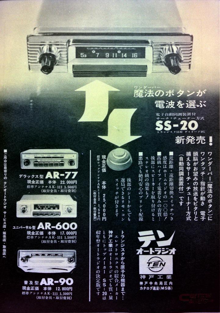 そして大手、62年の神戸工業テンオートラジオの最上級モデルは2.5万円で、プッシュボタンが消え電子選局、後席で選局可能、高級ハイファイ電蓄並み音質と自慢している。