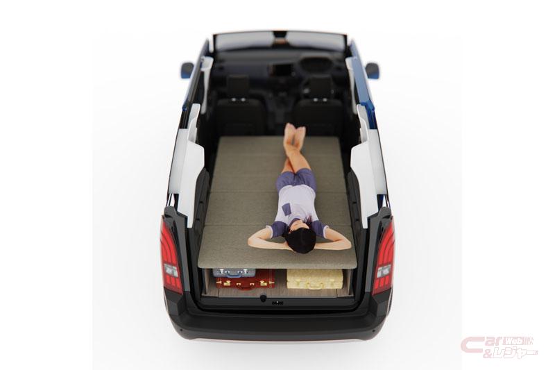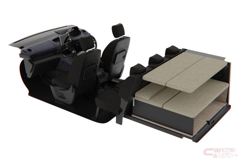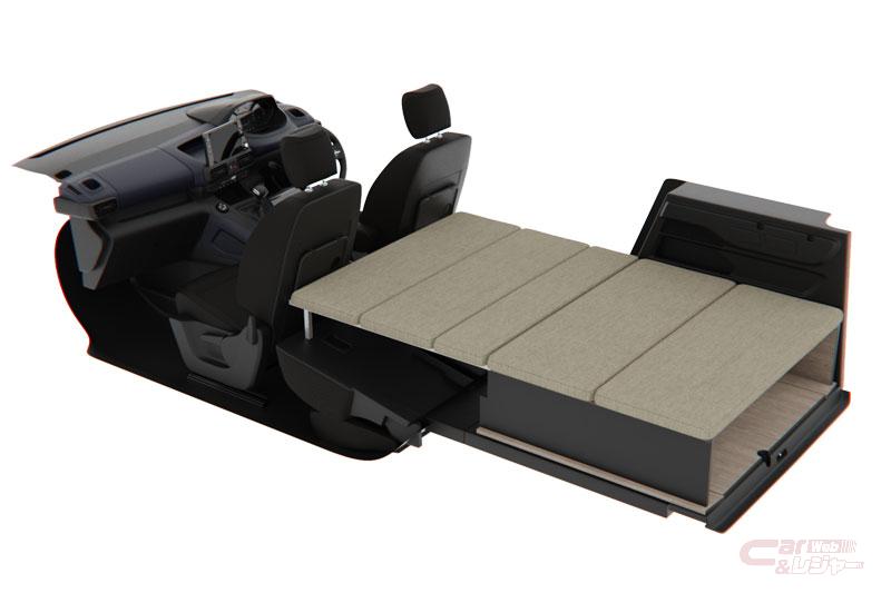 ベッド展開時のサイズは、ベッド厚さ約45mm、底面サイズ1800mm×1200mm、のサイズを確保し、展開時の室内高は650mm(最低位置。マルチパノラミックルーフ装備車両=GTの場合)、ベッド下は収納に活用できる270mmの空間を用意している。また、ベッドを畳んだ状態で戸棚としても使用できるのに加え、リアシートも使えることにより、ベッドキットを装着しても4名もしくは5名の乗車が可能となっている。