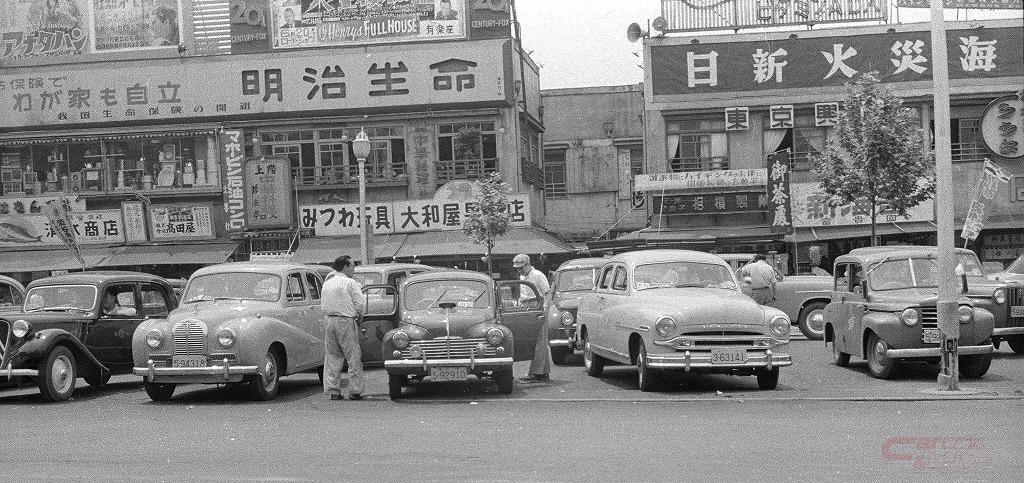 左から、シトロエン11CV/1934~57、オースチンA40サマーセット/53~54、ルノー4CV/46~61、仏フォード・ベデット/48~54と後方にダットサンDB/48~54、右端ダットサンスリフト/50~。