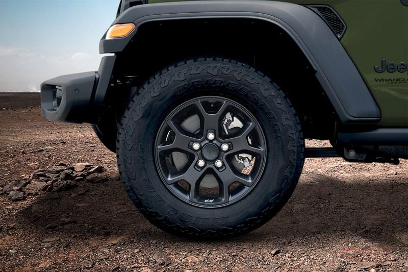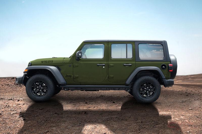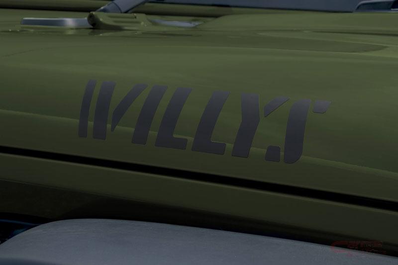 また、エクステリアはブラック仕上げの専用フロントグリルやグロスブラックに塗装された17インチアルミホイール、「WILLYS」ボンネットデカール、4 WHEEL DRIVEリアゲートデカールが装備されるほか、JeepバッジとTrailRatedバッジにはマットブラック仕上げが施されている。ボディカラーは、ミリタリー感を演出する限定車専用色のサージグリーンC/C(100台限定)と、通常はルビコン専用色であるスティンググレーC/C(200台限定)の2色を特別設定した。