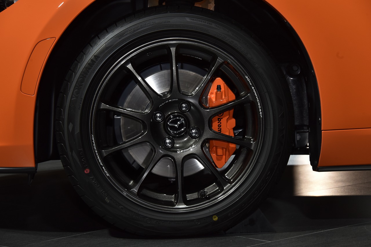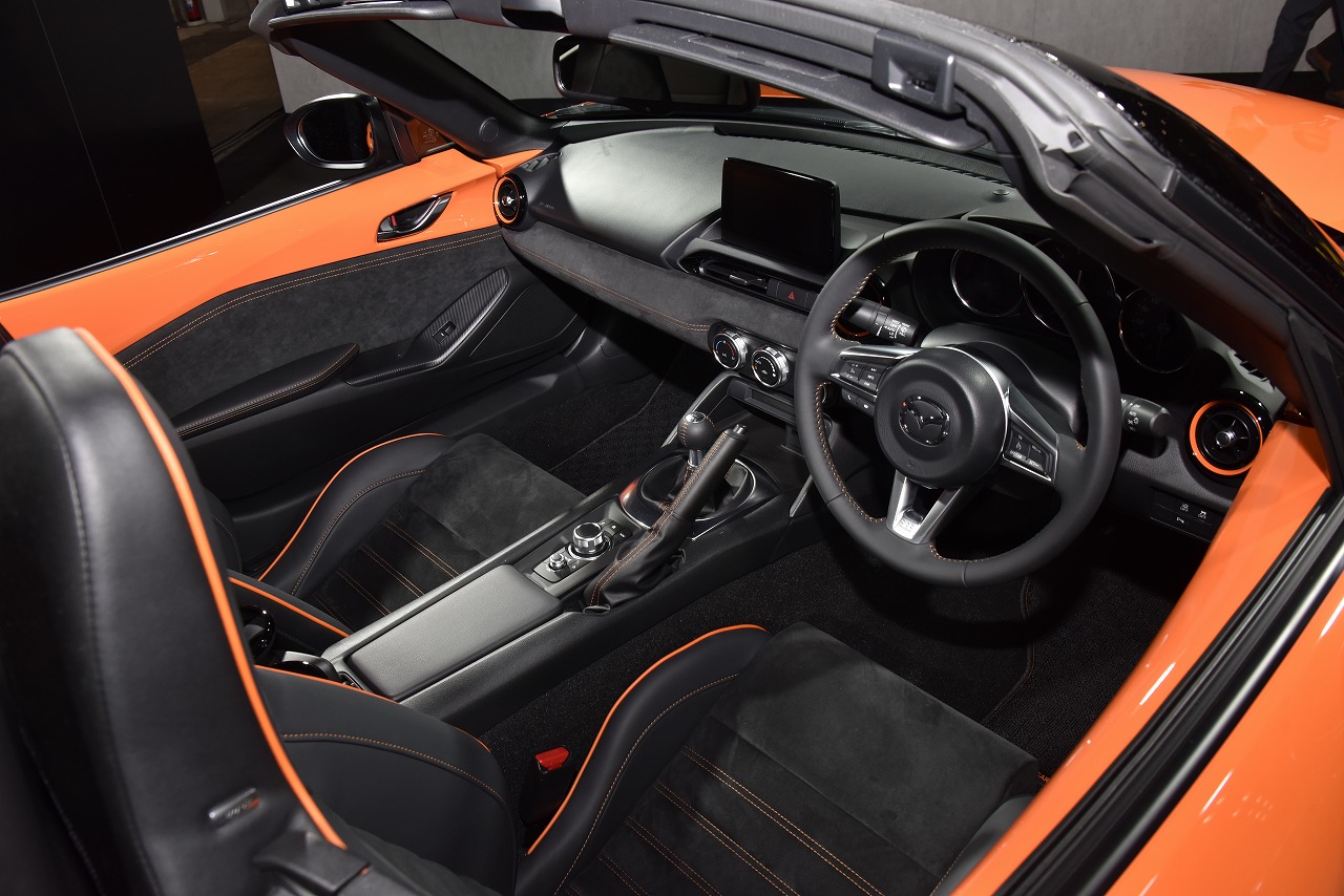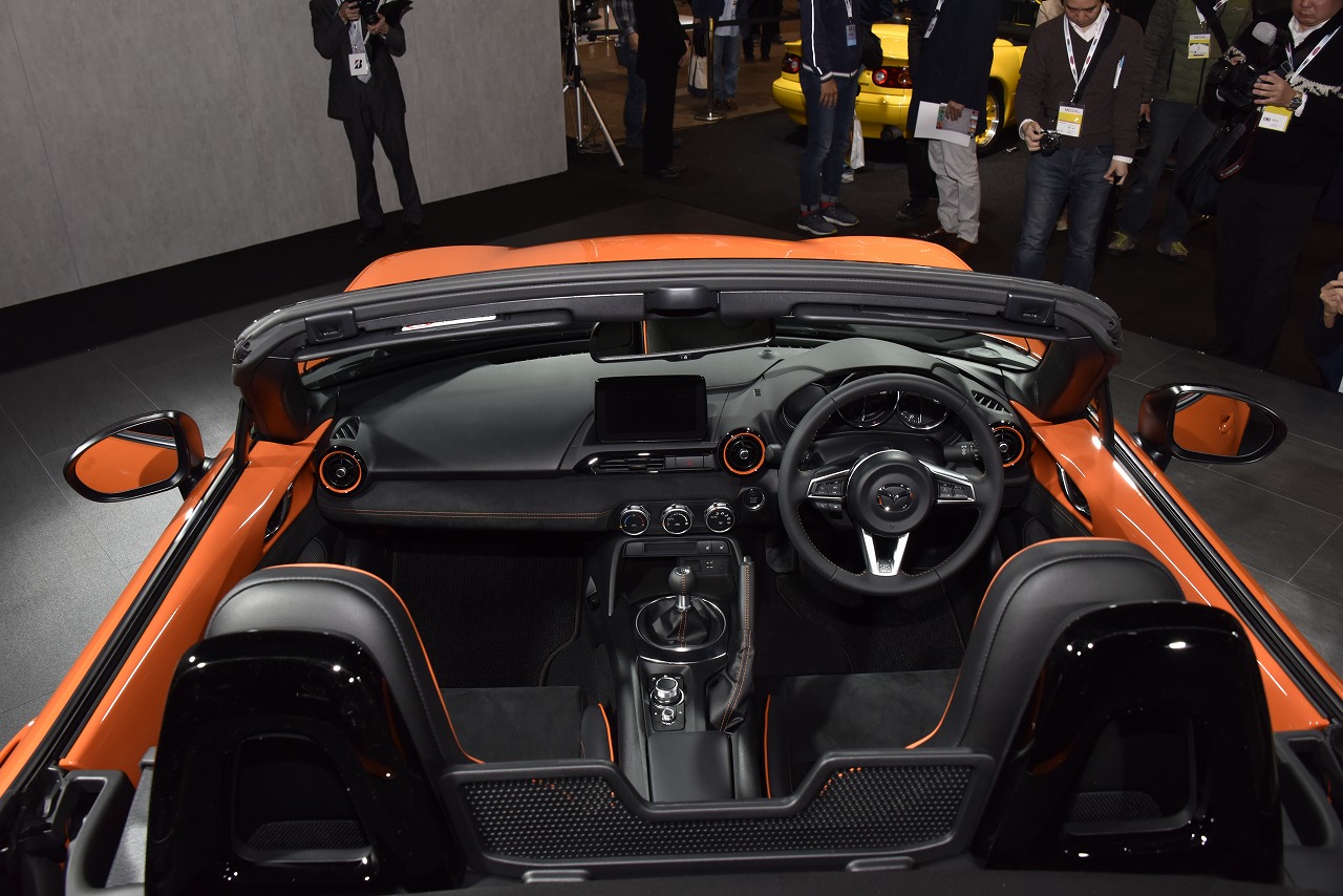 マツダでは、国内初公開のロードスター30周年記念車が注目を集めた。この特別仕様車はロードスターの誕生30周年を記念して製作され、今後のロードスターへの期待を込めて、心が沸き立つ1日の始まりを予感させる朝焼けのようなオレンジ系の専用色「レーシングオレンジ」を採用。中山雅主査は「これからもずっと走る喜びを届けたいという決意を込めた」と話し「内外に境目のないオープンカー独特のコーディネーションをするために、ステッチやパイピングなどもすべてオレンジ色で統一し、クルマ全体をひとつのボディカラーのコーディネーションとした」と見どころを説明した。