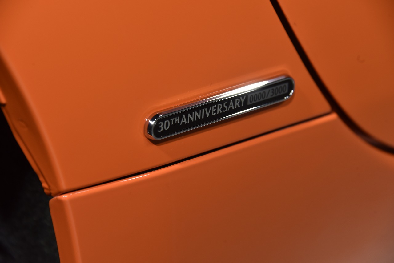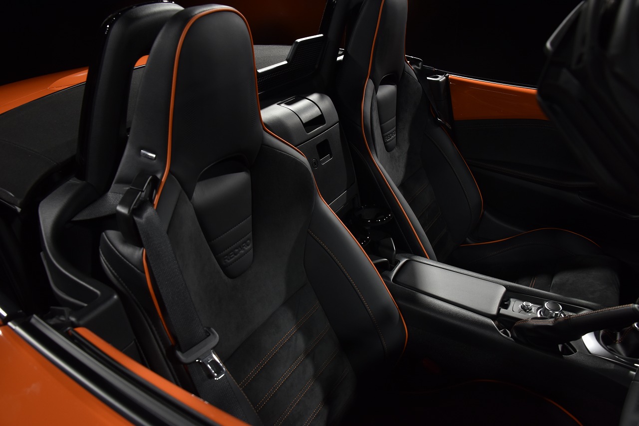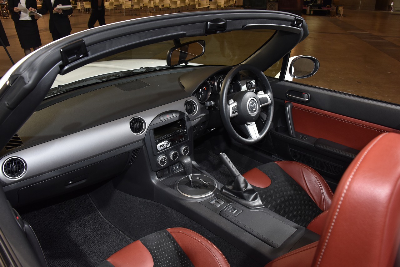 マツダでは、国内初公開のロードスター30周年記念車が注目を集めた。この特別仕様車はロードスターの誕生30周年を記念して製作され、今後のロードスターへの期待を込めて、心が沸き立つ1日の始まりを予感させる朝焼けのようなオレンジ系の専用色「レーシングオレンジ」を採用。中山雅主査は「これからもずっと走る喜びを届けたいという決意を込めた」と話し「内外に境目のないオープンカー独特のコーディネーションをするために、ステッチやパイピングなどもすべてオレンジ色で統一し、クルマ全体をひとつのボディカラーのコーディネーションとした」と見どころを説明した。