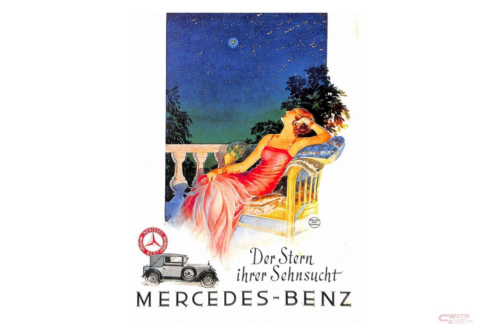 椅子でくつろぐ婦人の視線の先に輝くのは、スリーポインテッドスター。ドレスから想像しても裕福なご婦人だが、ちょっと捻った広告の目的は、これまで高性能・高級が売りのダイムラーでは初めての中級車、シュタットガルト型の広告なのである。