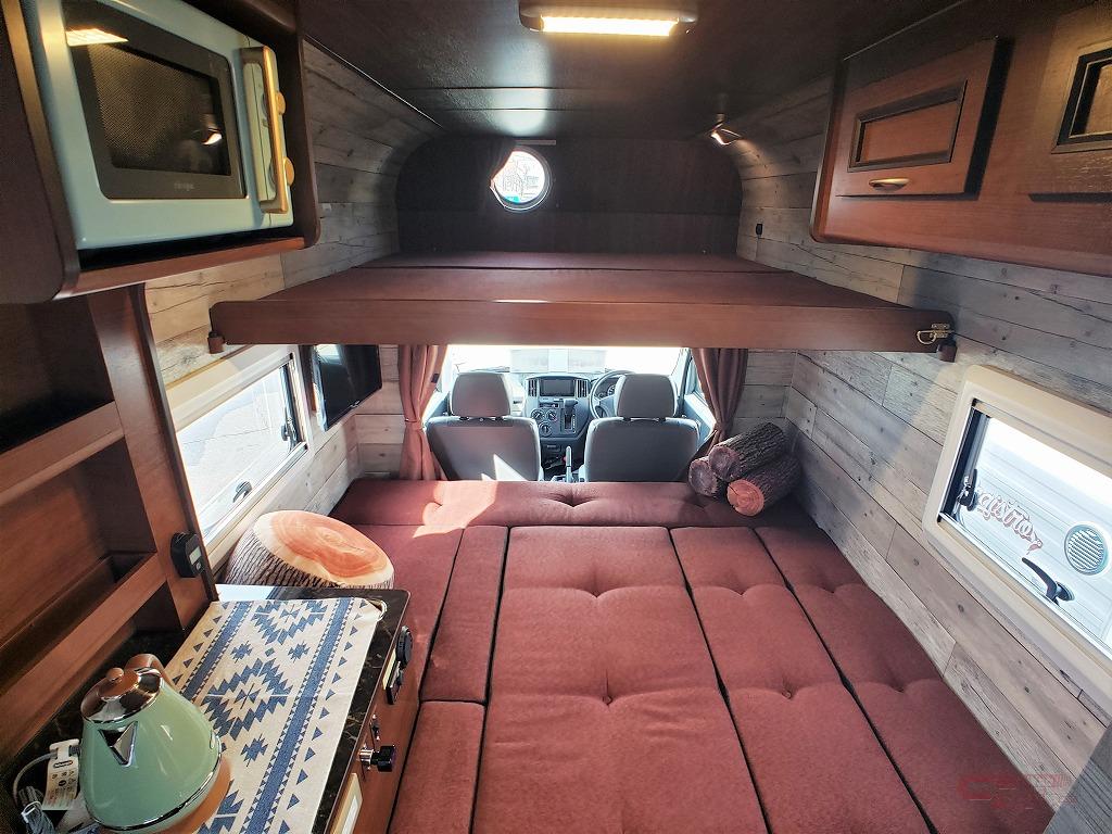 シートレイアウトは、L字シートと前向きシートの2タイプを設定。フロア全面をベッド展開でき、バンクベッド(奥行1600㎜×横幅1650㎜)と合わせて4人の就寝が可能。小さな子供がいるファミリーでも安心してクルマ旅を楽しむことができる。