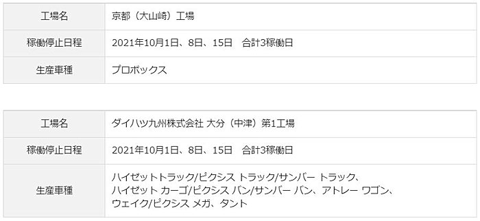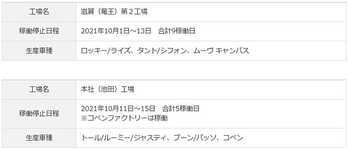 ダイハツ、10月の国内完成車工場の稼働停止を発表(9月21日時点) all 業界ニュース 2021年9月21日2021年9月22日 編集部1992 ダイハツは9月21日、東南アジアでの新型コロナウイルス感染拡大に伴う部品供給不足により、10月の国内完成車工場の稼働停止を発表した。 【10月の稼働停止日程】
