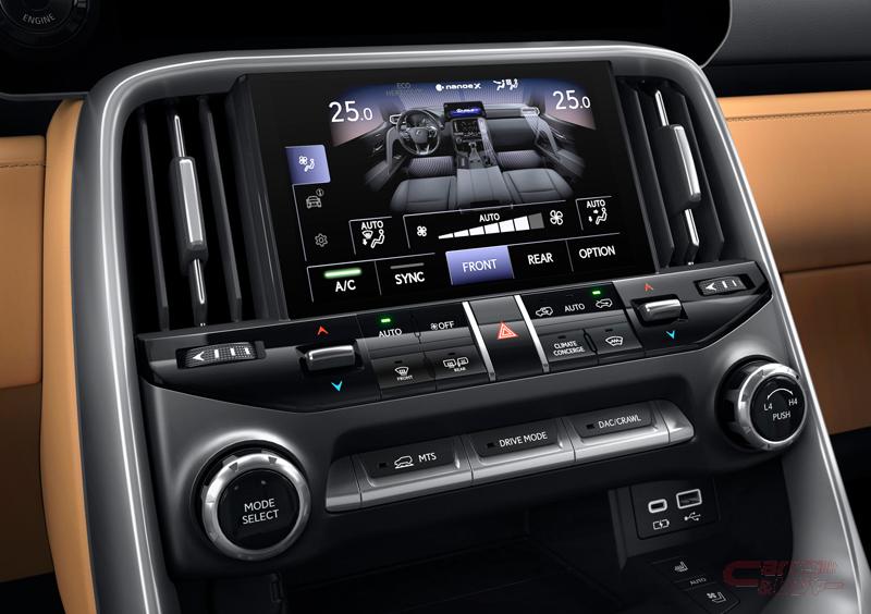 街乗りでも上質なドライブを楽しめるよう、レクサス初のGA-Fプラットフォームの採用や、約200kgの軽量化などのクルマの素性を刷新。加えて、高出力、高トルクのツインターボエンジンやECB、EPSを搭載することで、あらゆる走行シーンで減速、操舵、加速がシームレスに繋がる気持ち良さと接地感、力感、安心感のある走りを実現した。また、新AHC、AVS(Adaptive Variable Suspension system)を採用し、伝統のオフロード走破性と車両安定性はそのままに、フレーム車でありながら、オンロードでの高い車両コントロール性と優れた乗り心地を実現している。