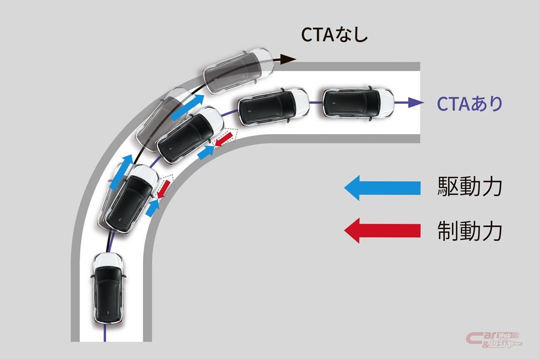 コーナーリングを安定化に寄与する機能として、CTA(コーナリングトレースアシスト)が採用された。旋回時、車両が外側に膨らんでいると検知した場合、内輪にわずかな制動力を加えることで旋回方向を補正する。