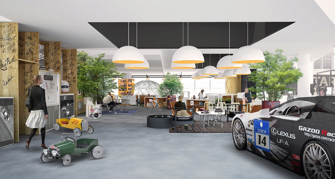 室内は青、赤、緑の3エリア構成。青のエリアは北欧調のイスやソファ、テーブルが並んだ明るい空間とし、赤のエリアには実際にレースを走ったレーシングカーやクルマのパーツを展示。芝生のように敷き詰められたグリーンカーペットが目印の緑のエリアは、ピクニック気分で靴を脱いでリラックスすることもできる。