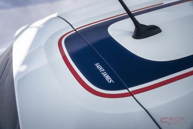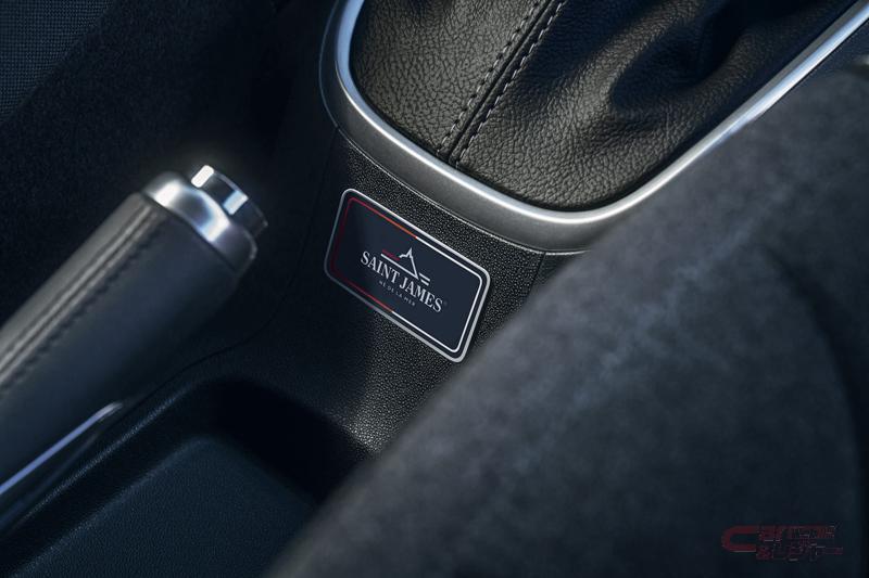 さらに、インストルメントパネルはブラックのテップレザーとホワイトのステッチで仕上げ、センターコンソールシフトレバー下にはSAINT JAMESのバッジを装備しているほか、インナードアハンドルには青と赤のSAINT JAMESのドアハンドルアクセントを追加した。その他、白いパイピングが入った専用フロアマットと取扱説明書などを入れる専用ハンドブックケースも特別装備している。