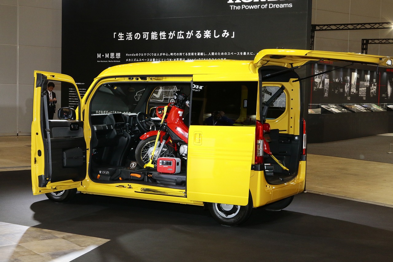展示車のシティも居住性や燃費、動力性能など機能を最大限に追求しつつ、エンジンやサスペンションなどメカニカル部分は最小に設計された。昨年発売のN-VANは”働くクルマ”だが、同社独自のセンタータンクレイアウトや専用のシート設計により、助手席のスペースまで低床でフラットな荷室を実現した。