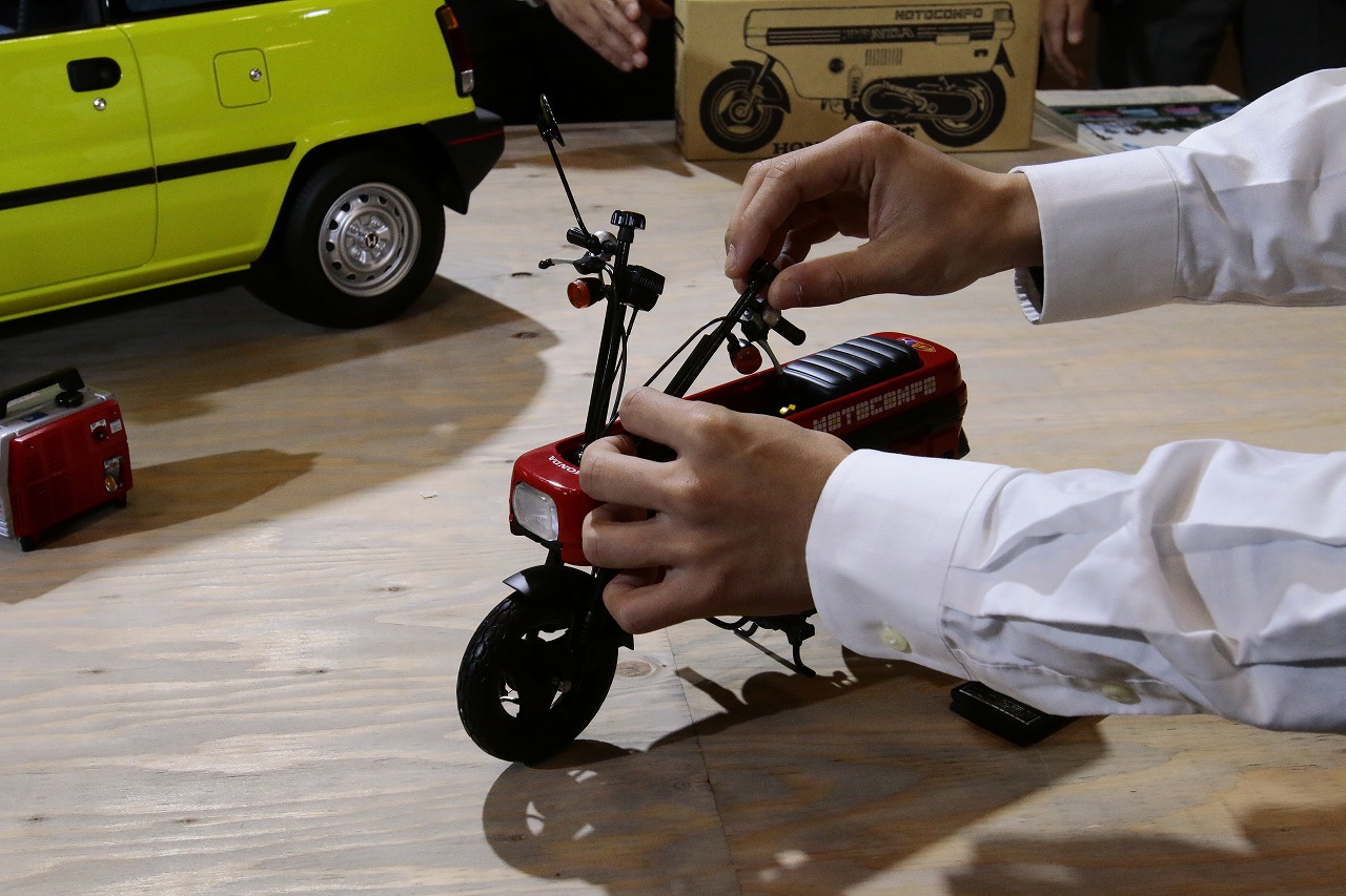 スケールモデルは、同社のデザインスタジオの若手スタッフが制作したもので、現在の最新計測技術により、当時存在しなかった3Dデジタルデータを作成し、それを元にスケールモデルが制作されたという。モトコンポの折りたたみ式ハンドルなど、手書き図面による設計ながら複雑な機構が備わった製品を体感することで、先人へのリスペクトが生まれるきっかけとなった。