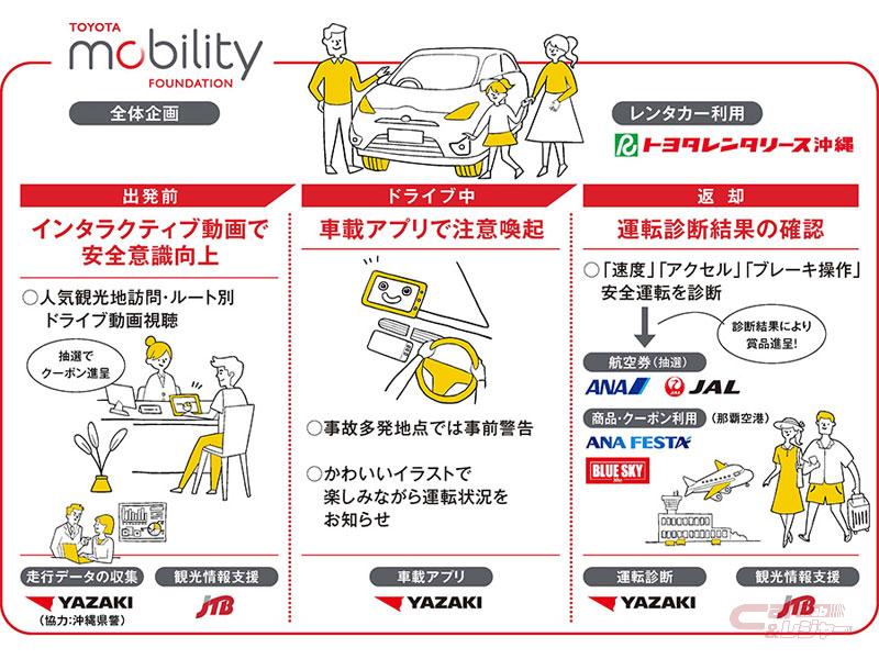 同事業の実施にあたっては、データの活用と分析、ツールの開発、車両への取り付け等、仕組みの構築に向けて、矢崎総業株式会社、株式会社トヨタレンタリース沖縄、株式会社JTBが協力し、全日本空輸株式会社、日本航空株式会社、ANA FESTA株式会社、株式会社JALUXエアポートは特典の提供を通して支援を行う。