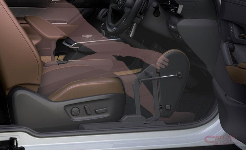 運転システムは、手で直感的に加減速を行う「アクセルリング(直感コントロール機能付き)」と「レバーブレーキ(押し込み式)」を採用。加速時は、運転しやすく、素早く慣れることができるよう、操作意図に応じた滑らかな挙動の実現を目指した。 減速時は、力を発揮しやすい軌道にレバーを配置するとともに、肘をサポートするブレーキサポートボードを支点に、肘から先での細かなブレーキ操作を実現。手での手動運転と、従来の足でのペダル運転操作の選択が簡単に行える。また、車いす利用者の運転席への乗り移りをスムーズにする、ワンアクションで折りたたみ可能な「移乗ボード」を用意している。