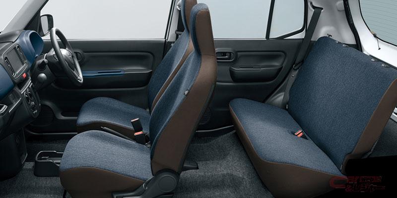 インテリアでは、エクステリアと同様に「気軽」「安心」「愛着」をコンセプトとし、抑揚のある面や線で厚みと立体感を表現した毎日乗っても飽きのこないデザインに一新。インパネとドアトリムに落ち着きのあるネイビーカラーを採用し、質感の高さや居心地のよさを表現。デニム調のシート表皮を採用したほか、シート背面はブラウンとし、シート全体で親しみやすさを演出している。