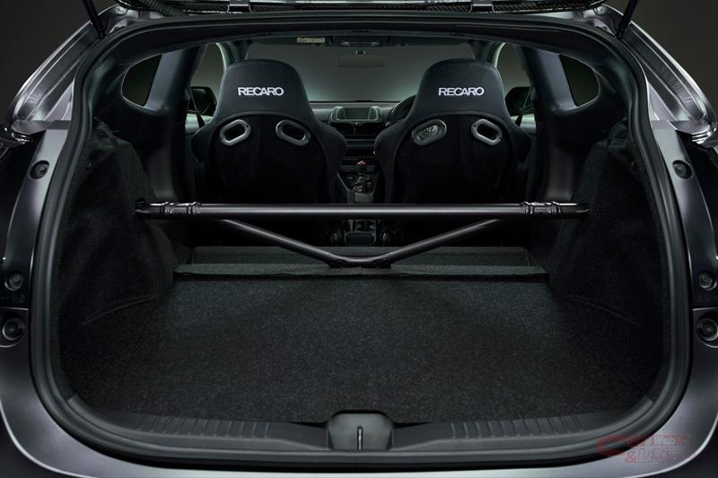 - 軽量高剛性なカーボン(綾織CFRP)をフードやルーフ、リヤスポイラーなどに採用したことに加え、リヤシートを撤去し、乗車定員を2名としたことにより、約20kgの軽量化を実現した。