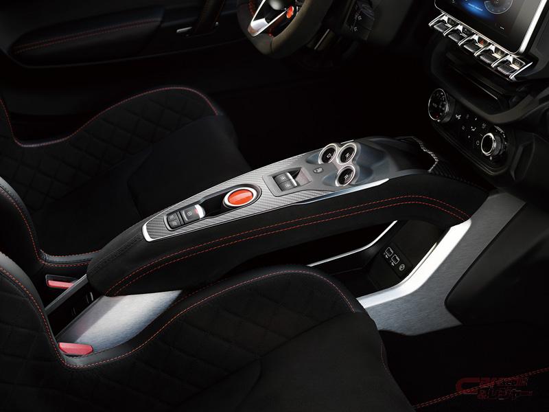 インテリアは、アルミ、カーボン、マイクロファイバーを使用した、レーシーなデザインを採用。Sabelt製軽量モノコックバケットシート、ダッシュボード、ステアリング、ルーフトリムはマイクロファイバーで統一し、オレンジのステッチを全体に施しているほか、オレンジのシートベルトを装備している。