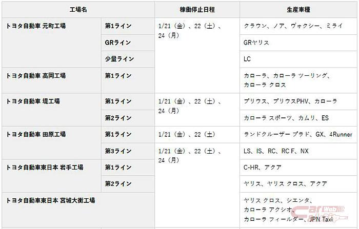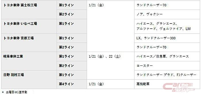 トヨタ、国内11工場20ラインで最大3日間稼働停止(1月21日時点) all 業界ニュース 2022年1月24日2022年1月24日 編集部1891 トヨタは1月21日、新型コロナウイルス感染拡大による部品供給不足により、1月21日(金)、22日(土)、24日(月)の国内工場の追加稼働停止を発表した。 【1/21(金)、22(土)、24(月)の稼働停止工場(全14工場28ライン中、11工場20ライン)】