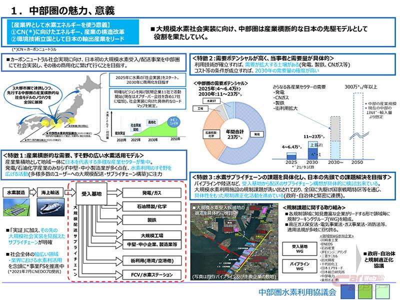今回の協定締結の背景には、「2050年のカーボンニュートラル」を目指す中で「水素社会」の実現は重要な役割を担っており、大規模水素のサプライチェーン構築に向けては、政府・自治体・経済界・産業界が一体となった取り組みが必要となり、中部圏では多様な産業が広く展開し、CO2削減/水素需要のポテンシャルが大きく、産業構造・エネルギー転換及びサプライチェーン改革を図っていくためのモデル地域として最適であるとの認識から協定の締結に至った。