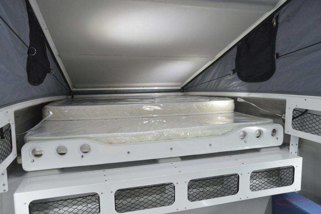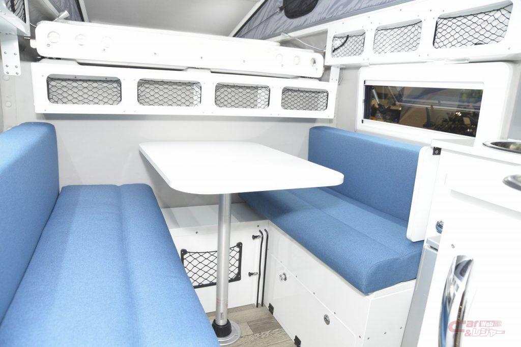 インテリアは2×2の対面ダイネットを配置。40L冷蔵庫や二口コンロ、丸型シンク、ウォーターポンプ等を標準装備し、コンパクトな室内に必要な装備を凝縮した。また、片開きのボップアップルーフを搭載し、展開時は大人が立って歩けるほどの快適性を発揮する。