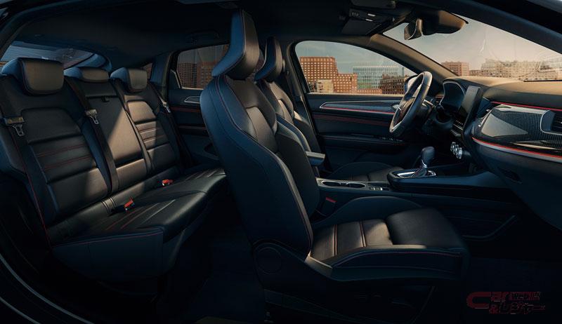インテリアは、モータースポーツの血統を受け継ぐルノー・スポール由来のR.S. LINEデザインを取り入れており、ドアトリムとダッシュボードには、カーボン調パネルを採用し、レッドラインのアクセントがスポーティな印象を向上。レザー×スエード調コンビ6ウェイ電動フロントシート、レザーステアリングホイール、シートベルトに施されたレッドステッチが、スポーティさに加えて上質さを演出している。