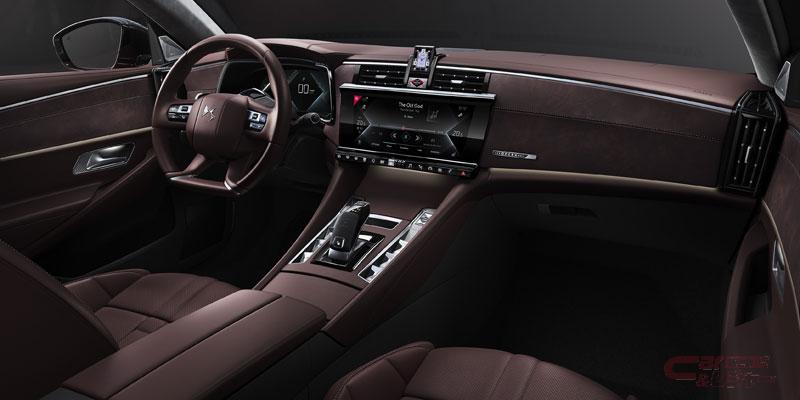 2895mmのロングホイールベースを確保。ひざ下レッグスペース約277mmと余裕ある空間を生み出しているリアシートは、フロントシートと同様かそれ以上の快適性を提供するDS LOUNGEと呼ばれるコンセプトで造られている。OPERA(オペラ)にはルビーのような深紅が印象的なアールルビィと呼ばれるムラ染のレザーを貼り込み、インストルメントパネル正面と上面、前後ドアトリム上部、そしてDSオートモビルのシグネチャーともいえるウォッチストラップデザインのシートにナッパレザーを使用しているほか、これら要所要所にオートクチュールのドレスの技法を由来とするパールトップステッチをあしらっている。